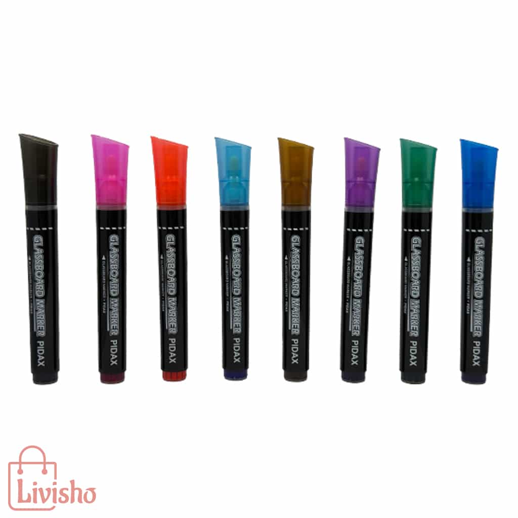 یک پک ۸ عددی ماژیک گلس برد با رنگهای فلورسنت: مشکی، صورتی، قرمز، آبی کمرنگ، قهوهای، بنفش، سبز و آبی پررنگ